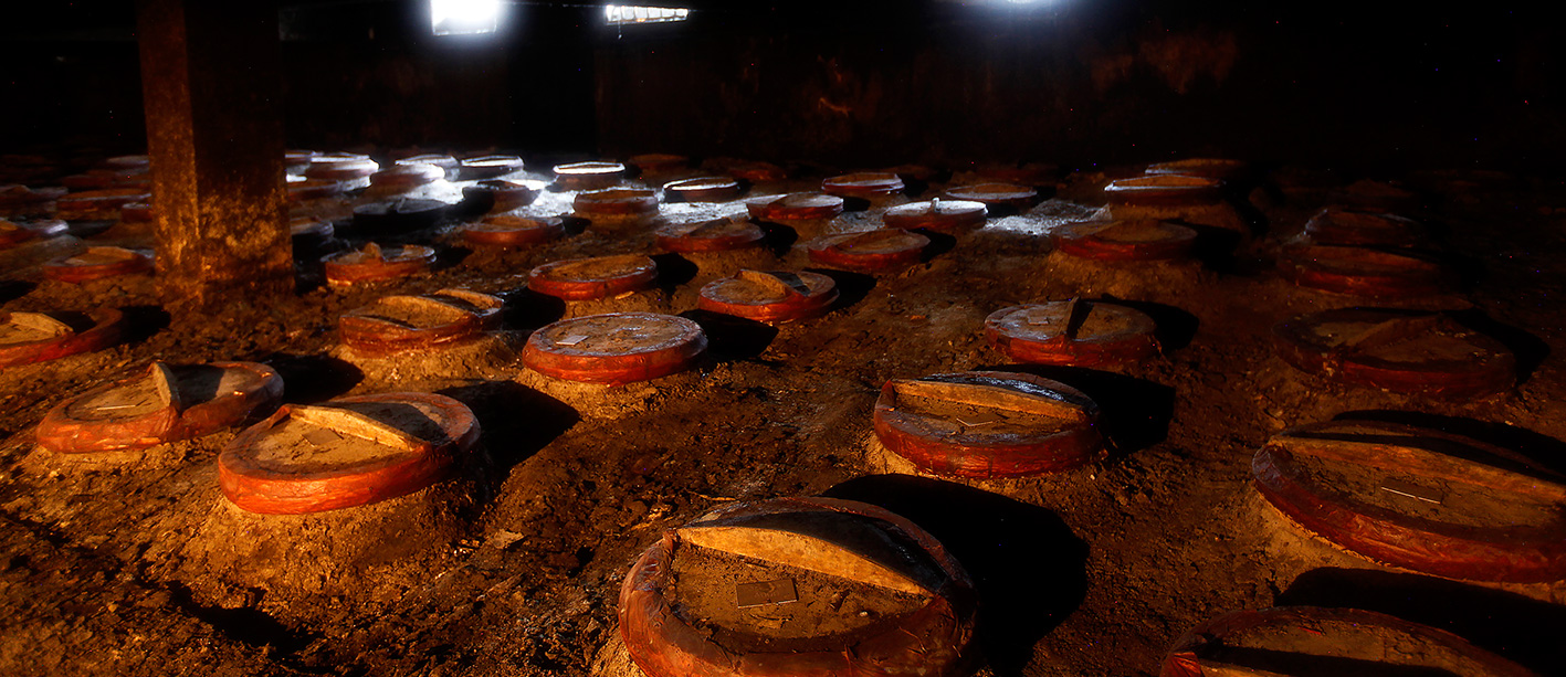 地下酒窖總占地面積3322平方米,總建筑面積5658平方米,窖內(nèi)共有陶壇3800余只,儲(chǔ)酒陶壇壇齡在百年以上,被譽(yù)為“中國白酒的地下宮殿”。儲(chǔ)存的原酒在獨(dú)特的培土窖藏環(huán)境中,歷經(jīng)歲月沉淀,酒體自然老熟,成為滴滴珍貴的稀世陳釀,被稱為“液體黃金”。