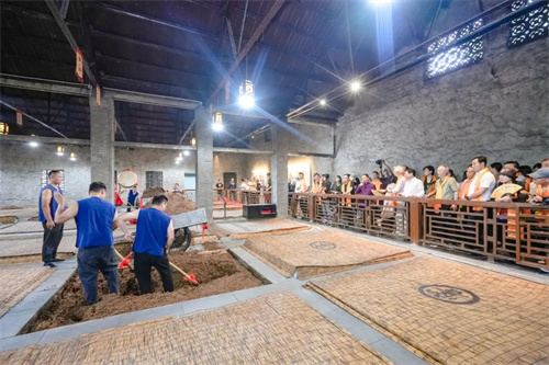 隨著紅色紗幕掀開,歲月悠久、古法釀造的頭排酒開窖區(qū)緩緩展示在嘉賓們面前。“千年老窖萬年糟,酒好全憑窖池老”,雙溝擁有三百年以上古窖池一千多條,其中更包含了630年窖齡之久的明朝珍寶窖池,其含有的微生物賦予了原酒特有的香味,成就了魅力獨(dú)特的雙溝美酒。